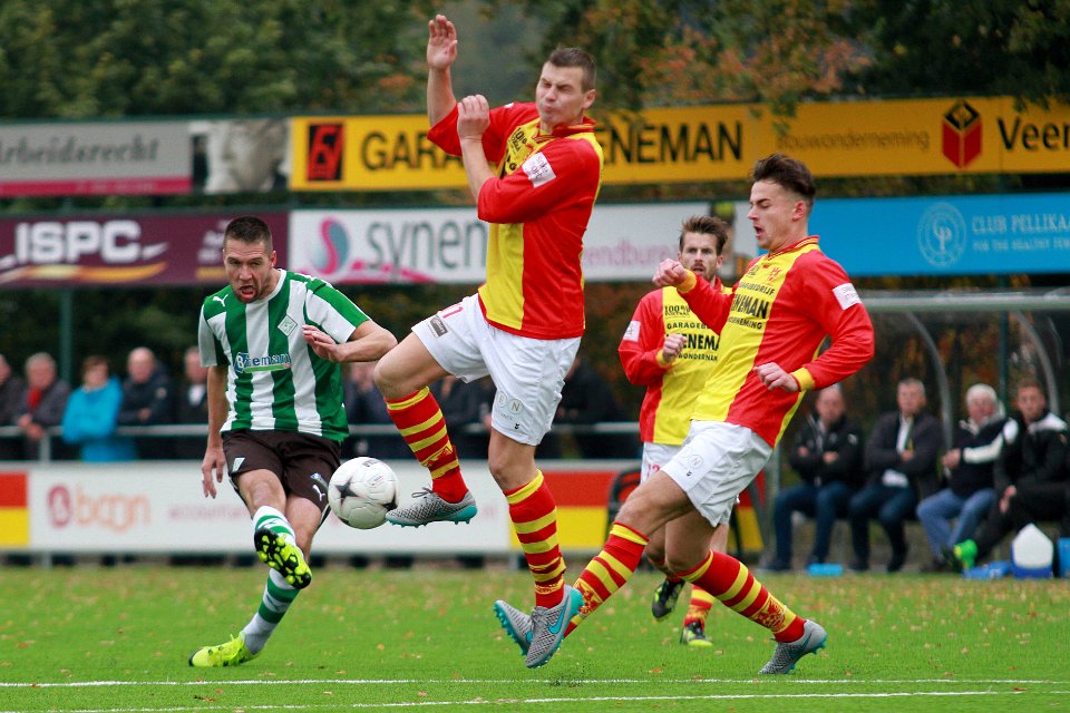 10 17-10-2015: Voetbal: CSV Apeldoorn v SC Genemuiden: Apeldoorn/Tjeerd Korf (l) of Genemuiden, Rob Diderik (m), Joost Krijns (r) of CSV Apeldoorn/Hoofdklasse C