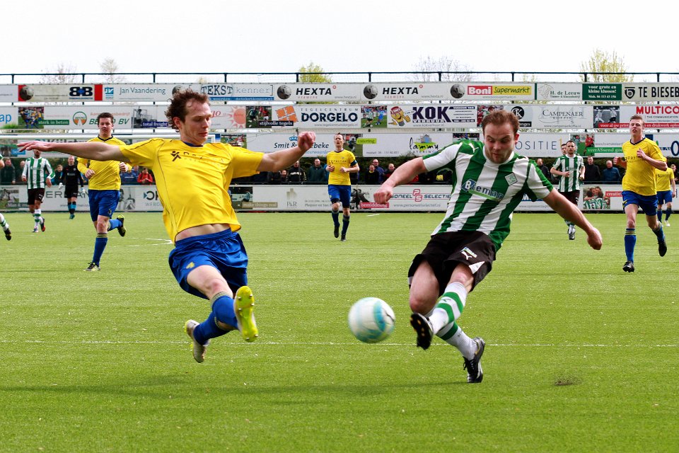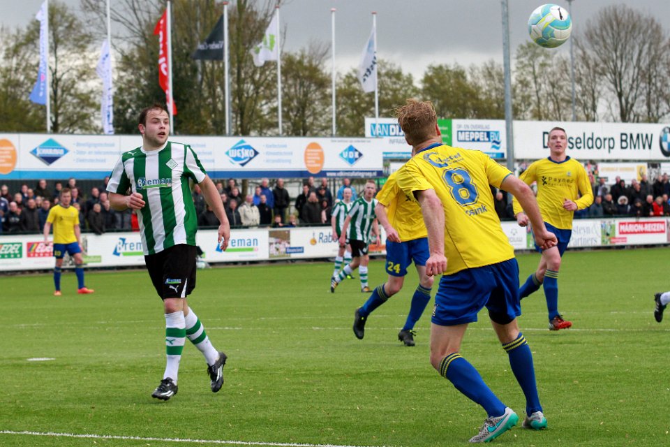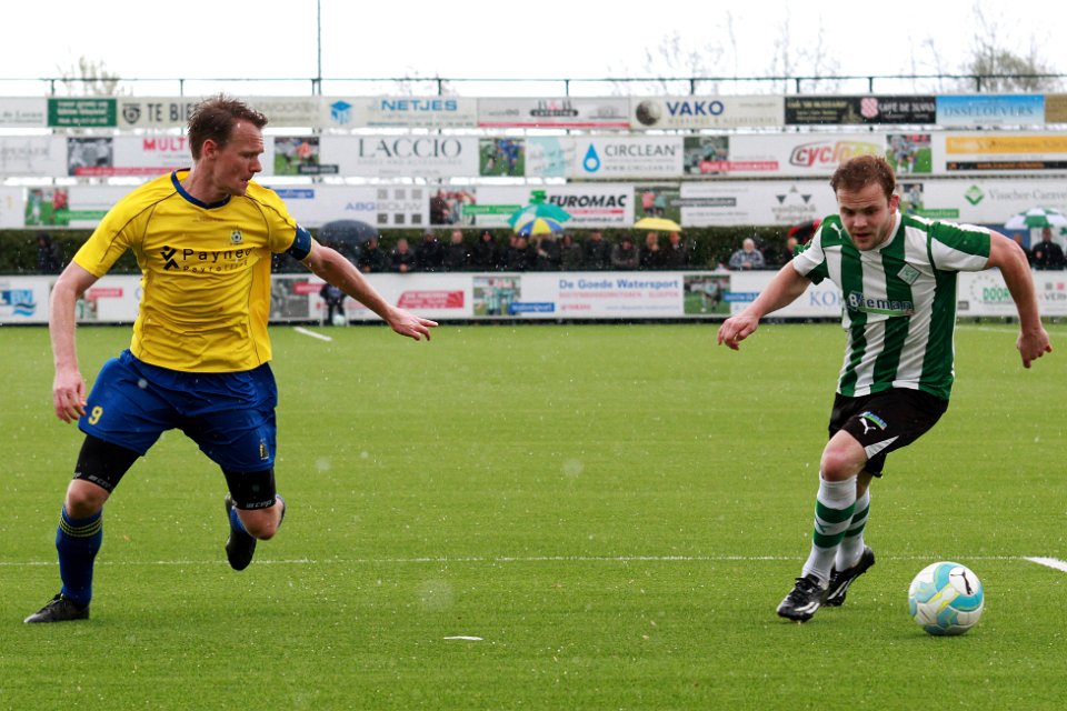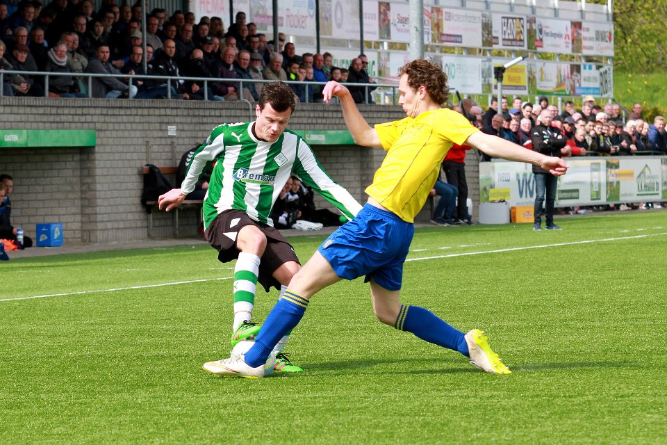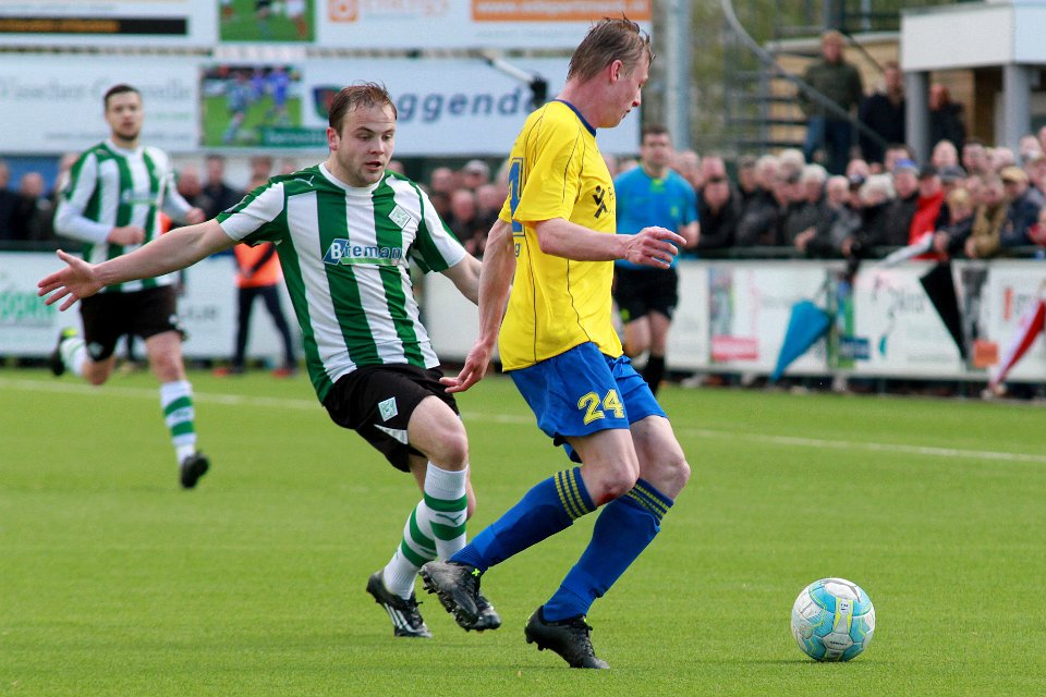 24 23-04-2016: Voetbal: SC Genemuiden v Staphorst: Genemuiden/Dennis Rosink (l) of Staphorst, Martijn Jansen (r) of Genemuiden/Hoofdklasse C zaterdagamateurvoetbal