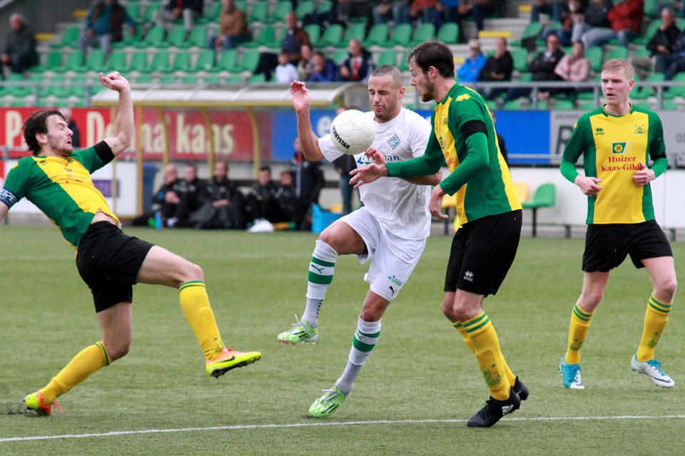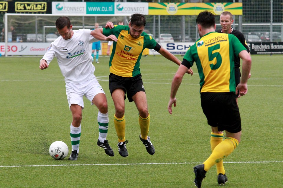 8 30-09-2017: Voetbal: Huizen SC Genemuiden: Huizen/Wouter Vente (l) of Huizen, Omar Kavak (m) of Genemuiden, Desmond Mensen (m) Aron Klaassen (r) of Huizen/ |
