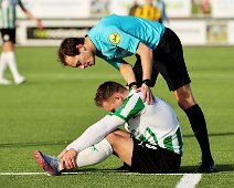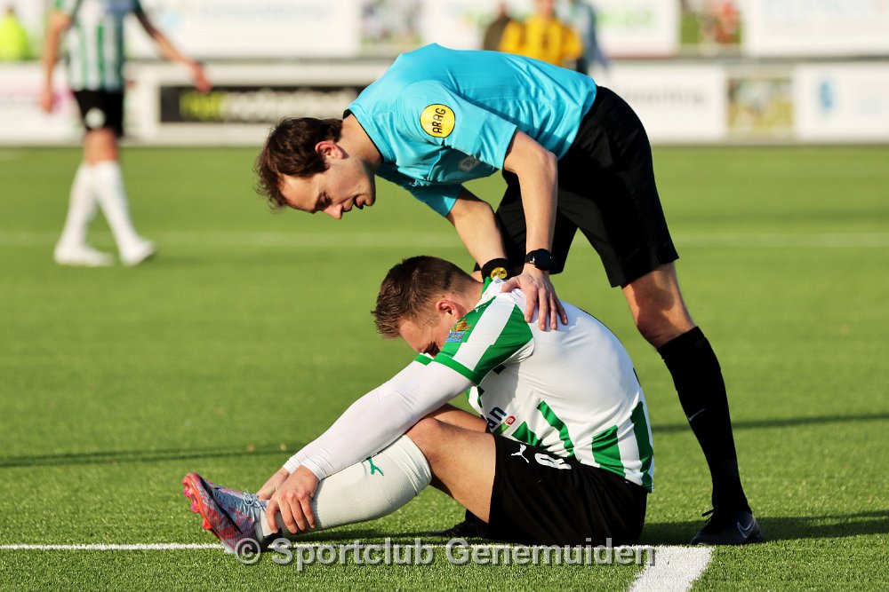 GENEMUIDEN, NETHERLANDS - JANUARI 27: Ref. Thom Winkel, Marc Magan of Genemuiden. Competition match between Sportclub Genemuiden vs DVS '33 at Sportcomplex de…