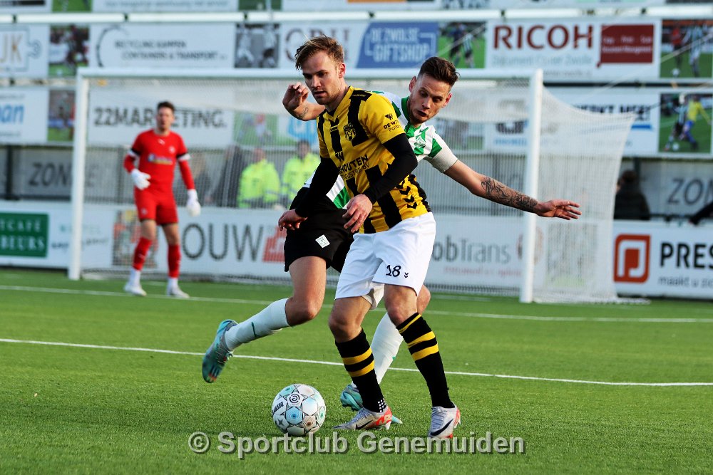 GENEMUIDEN, NETHERLANDS - JANUARI 27: Mike Reuvers of Genemuiden, Joël Dion van Berk (r) of DVS. Competition match between Sportclub Genemuiden vs DVS '33 at…