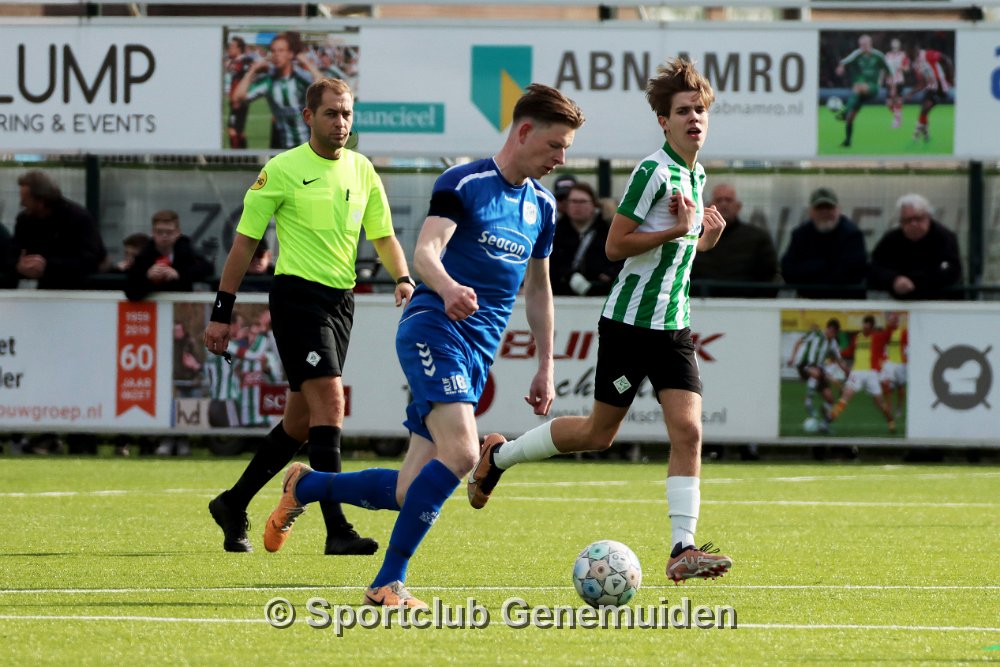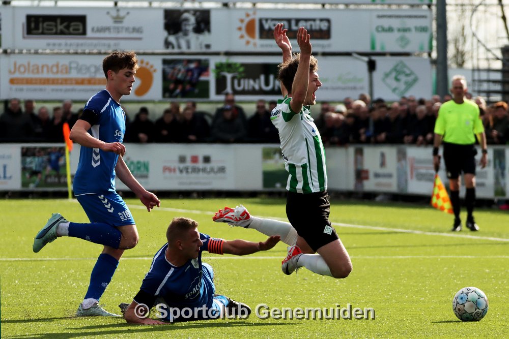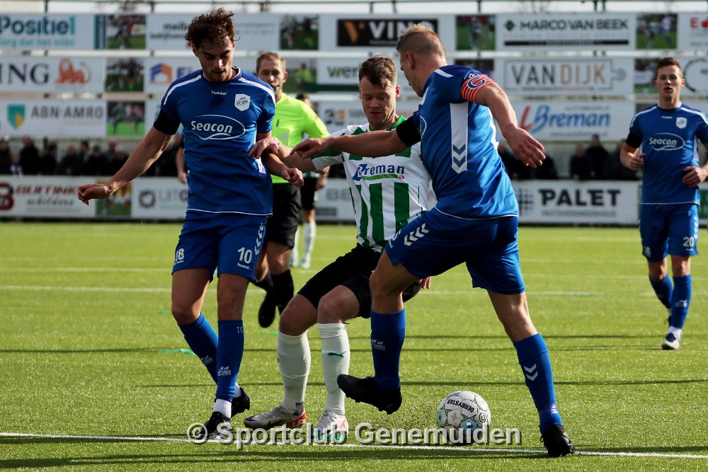 GENEMUIDEN, NETHERLANDS - MARCH 2 2024: Tim Ras (l), Bennie Dunnink (m) of Urk, Rens van Benthem (r) of Genemuiden. Competition match between Sportclub…