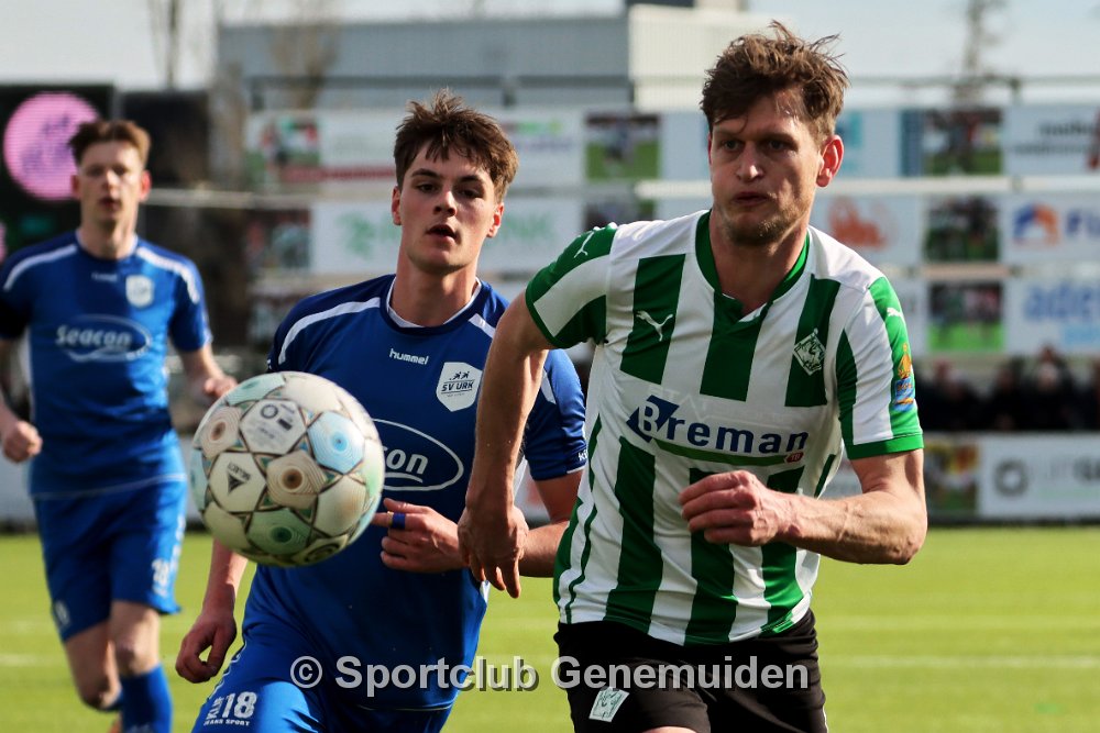 GENEMUIDEN, NETHERLANDS - MARCH 2 2024: Jan Ras (l) of Urk, Rutger Etten (m) of Genemuiden. Competition match between Sportclub Genemuiden vs IJsselmeervogels…