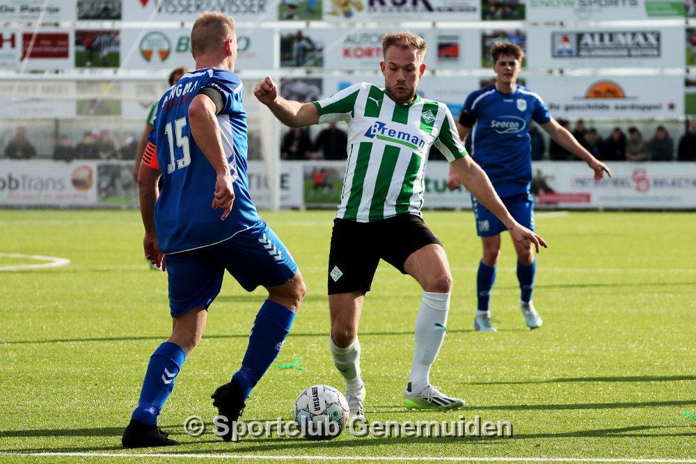 GENEMUIDEN, NETHERLANDS - MARCH 2 2024: Jens Jurn Streutker (l) of Genemuiden, Johannes Schrijver (r) of Urk. Competition match between Sportclub Genemuiden vs…
