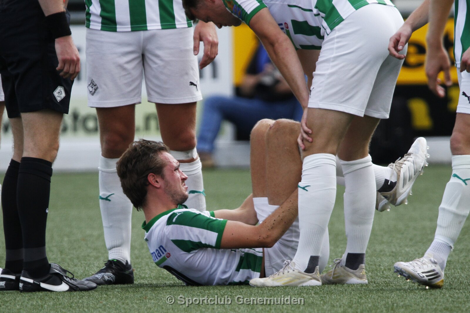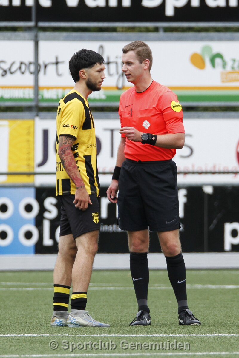 ERMELO, NETHERLANDS - AUGUST 16, 2025: Zico Jamai Soree (l) of DVS, Ref. Martin Wever. Competition match between DVS´33 vs SC Genemuiden at Sportcomplex DVS '33…