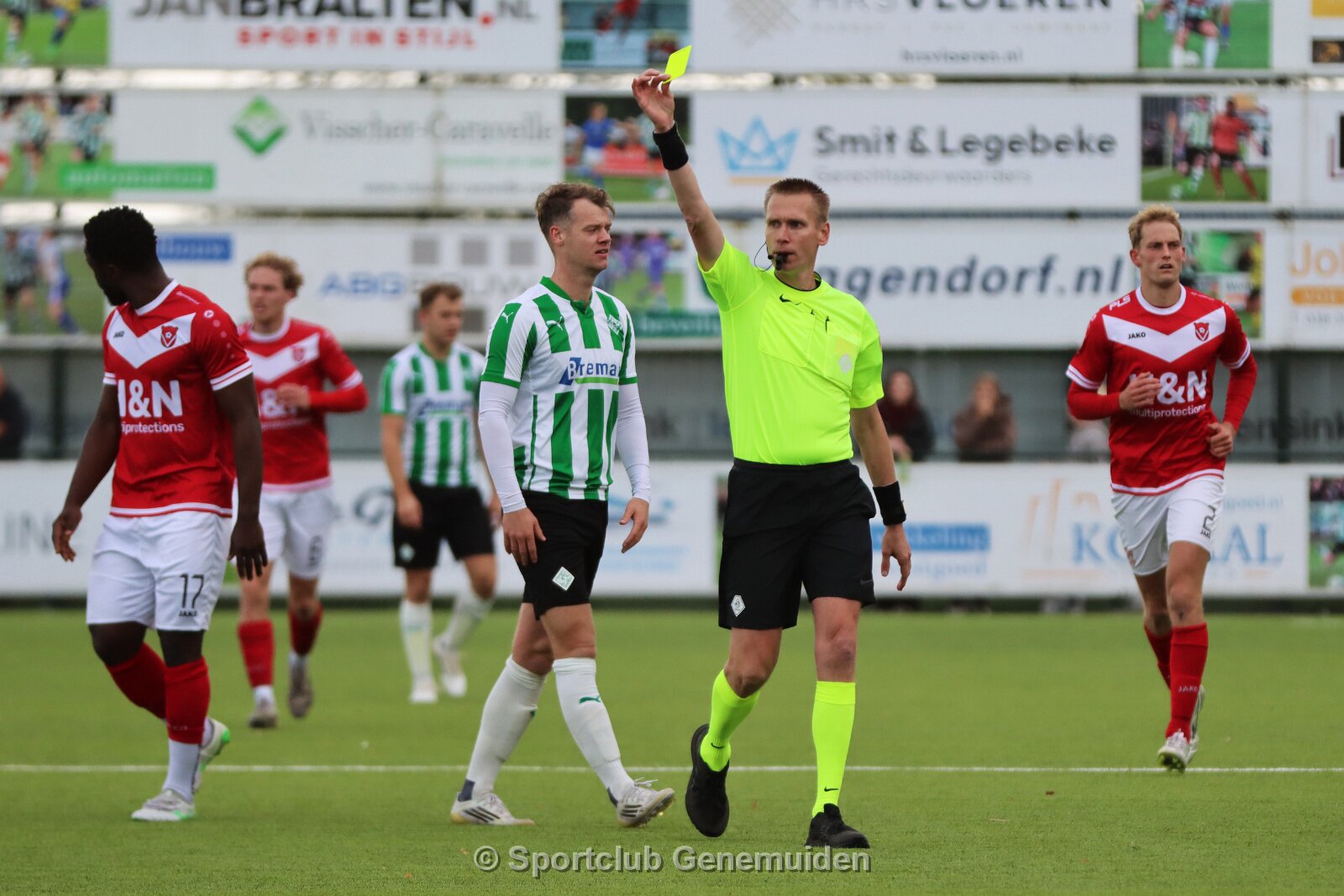 GENEMUIDEN, NETHERLANDS - OKTOBER 25: Rutger Etten of Genemuiden (l), Ref. Bjorn Kuiper (r).Competition match between SC Genemuiden vs Harkemase Boys at Sports…